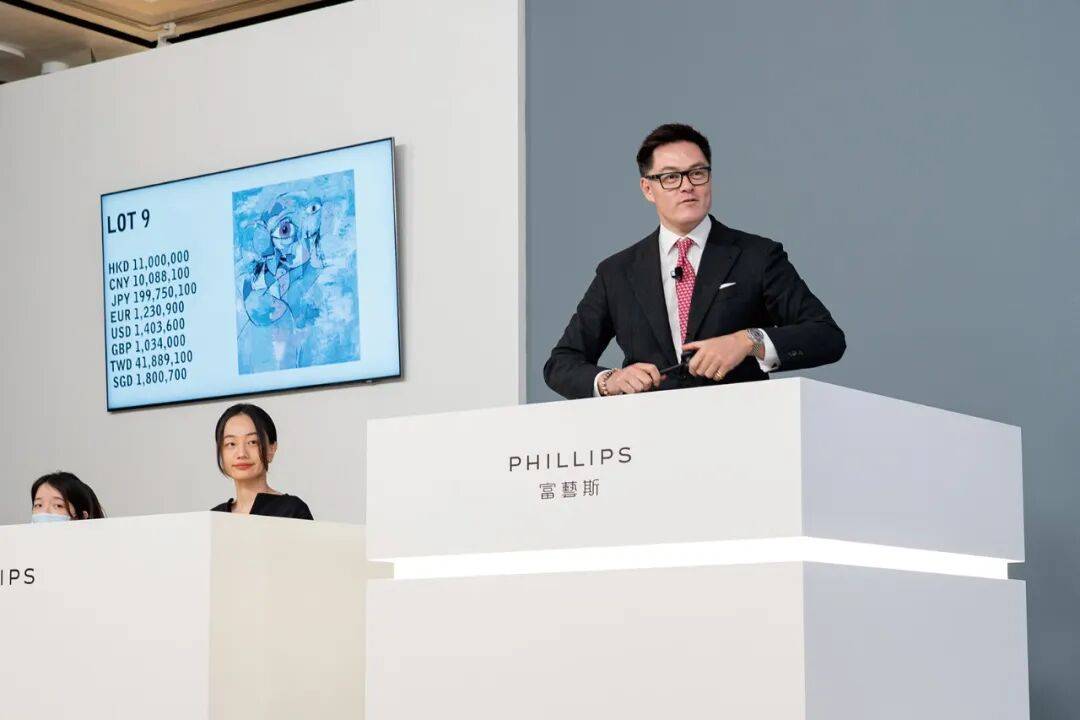 富艺斯亚洲区主席暨拍卖官陈遵文(Jonathan Crockett)在2025年5月27日举槌的富艺斯香港现代及当代艺术部晚间拍卖中拍出乔治·康多的《F蓝调》,以1376万港元成交